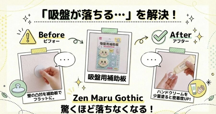 - 吸盤がすぐ落ちる悩みは、100均の「補助板」を併用するだけで解消できます。