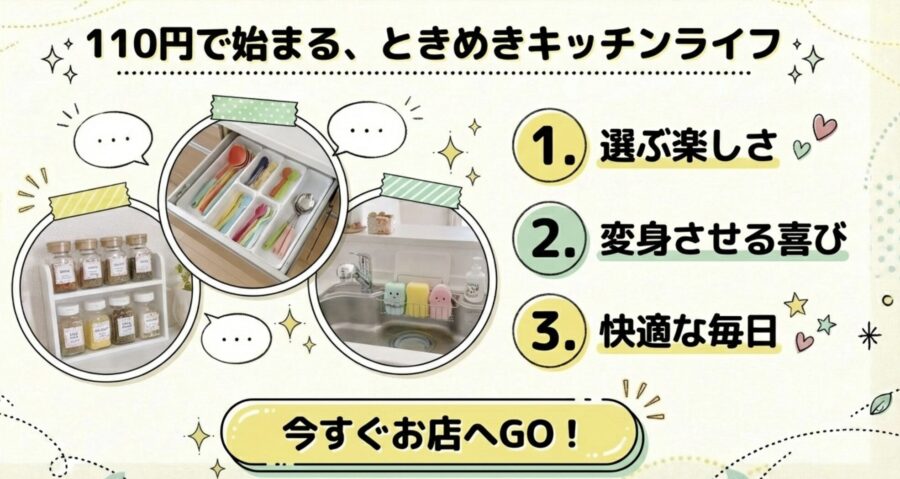100均のふきんかけは「選び方」と「設置のコツ」さえ知っていれば、高いメーカー品を買わなくても十分に満足できるアイテムです。