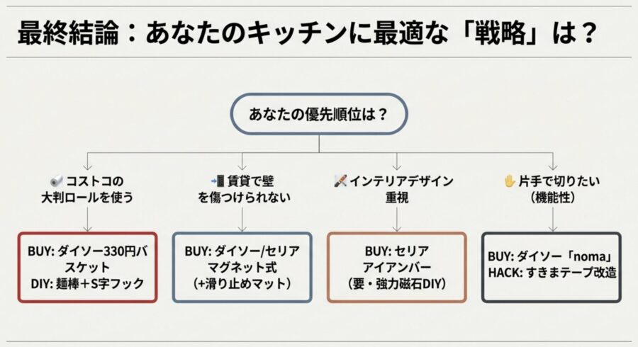 ここまで様々なホルダーと裏技を紹介してきましたが、「結局、私の家にはどれが一番いいの?」と迷っている方もいるかもしれません。