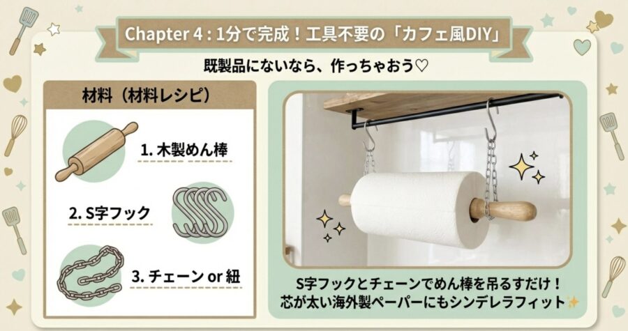 3. おすすめは「S字フック」活用:突っ張り棒に大きめのS字フックやワイヤークリップを引っ掛け、そこにペーパーホルダー(吊り下げタイプ)を連結させると、位置調整も交換もスムーズになります。