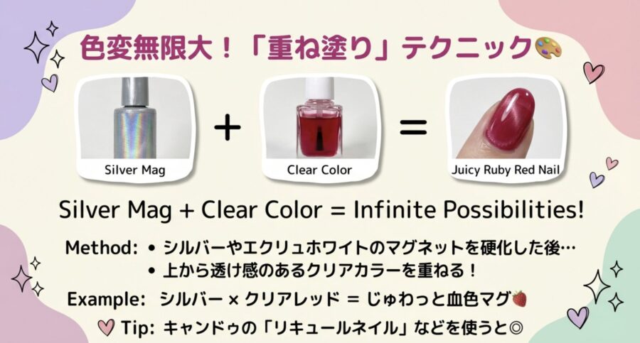 - アレンジに挑戦: お手持ちのカラージェルの上にマグネットジェルを重ねて「色変え」を楽しむ。