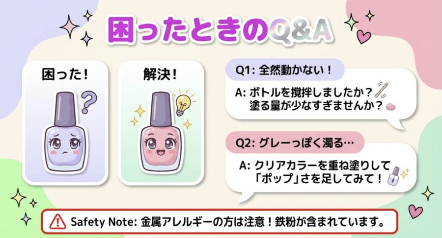 - 金属アレルギーの方は注意: マグネットネイルには微細な鉄粉が含まれているため、金属アレルギーがある方は使用を控える。