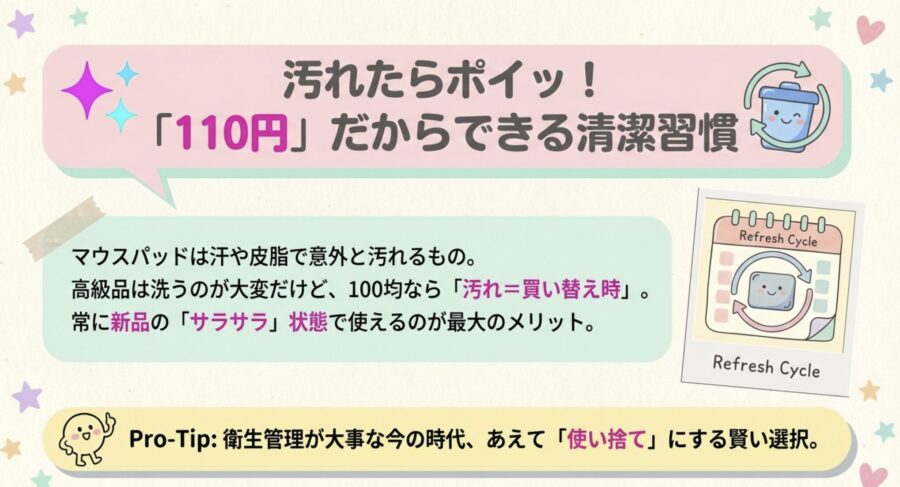 100均マウスパッドを賢く使い続けるコツは、「洗う手間を惜しんで、新品に変える」という割り切りです。