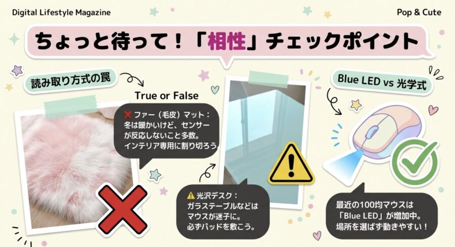 特に「光学式(赤色LED)」のマウスは、光沢のある素材や透明なパッドの上ではカーソルが飛んでしまうトラブルが起きやすいです。