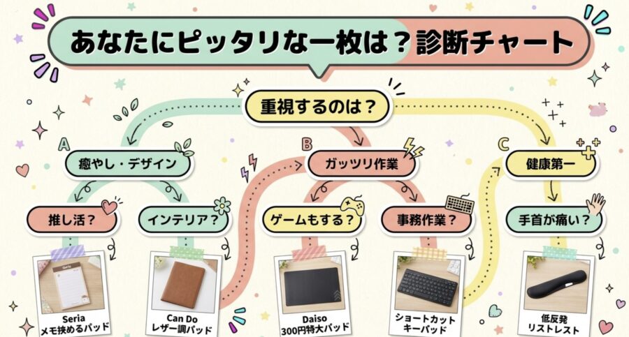 • 迷ったら: セリアの布製ゲーミングか、ダイソーの低反発をまず1枚。